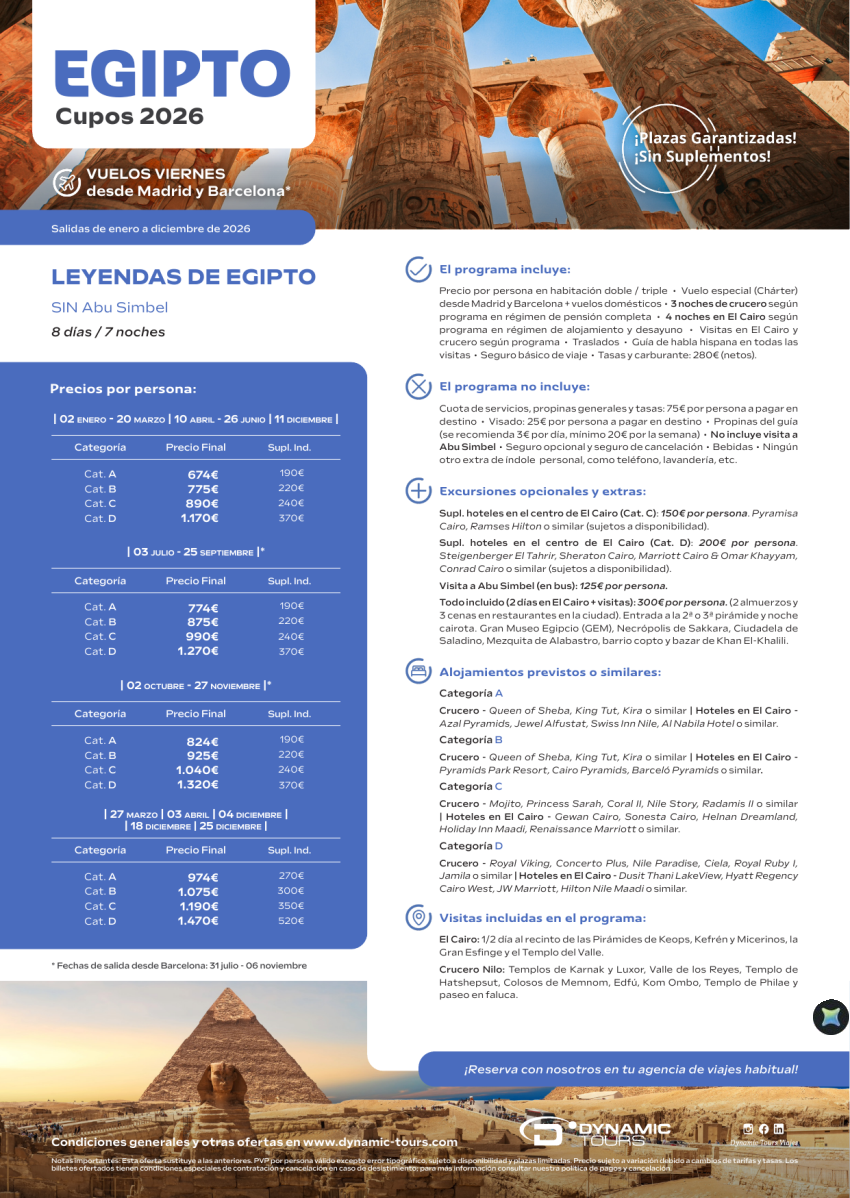 EGIPTO 【Leyendas de Egipto SIN Abu Simbel】『3cru+4cai』(✈ Madrid y Barcelona) desde 674€
