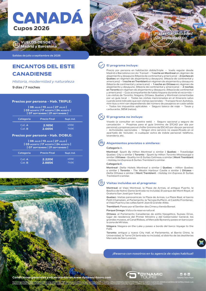 CANADÁ 【Encantos del Este Canadiense】『9 días / 7 noches』(✈ Madrid y Barcelona) desde 2.220€
