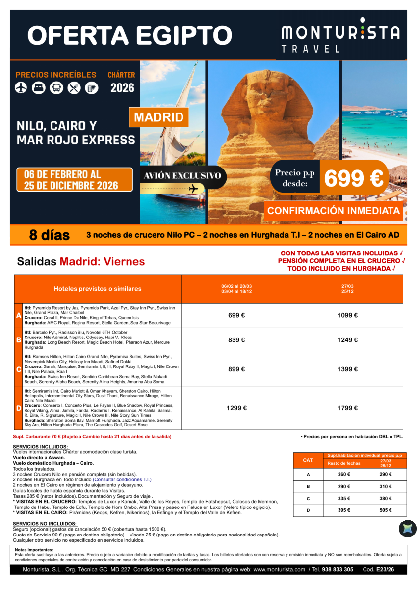 Nilo,Cairo y Mar Rojo Express*** desde 699€- salida MAD vnes. chárter Aswan,3ncrucero+2nHurghada+2nCai+visitas