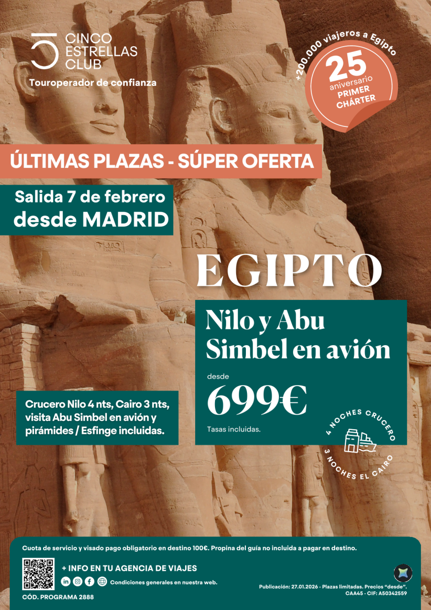 Súper Oferta Últimas Plazas Egipto Nilo y Abu Simbel en avión 8d/7ns pvp 699€ sal. 07 Febrero desde Madrid