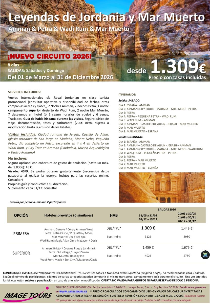 Nuevo programa Leyendas de JORDANIA *circuito Premium* con Petra, Wadi rum y relax en Mar Muerto, dsd 1.309€