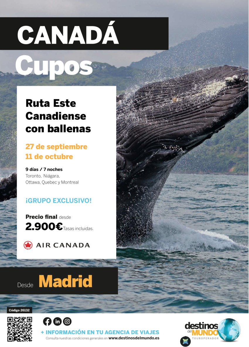 🇨🇦🐋Ruta del este canadiense con ballenas 🇨🇦🐋9 d / 7 n /27 de Sep 11 de Oct origen: Madrid desde 2.900€